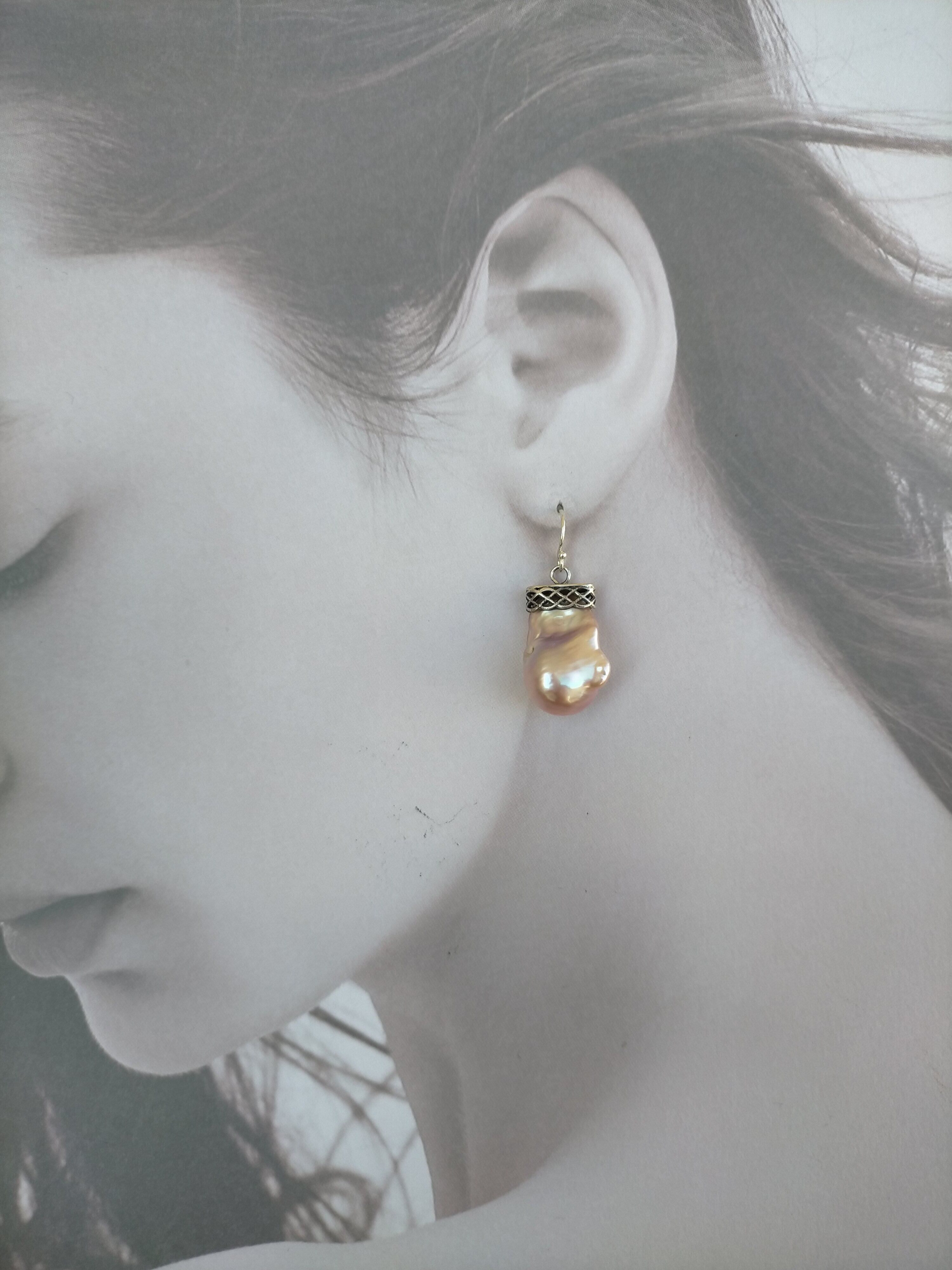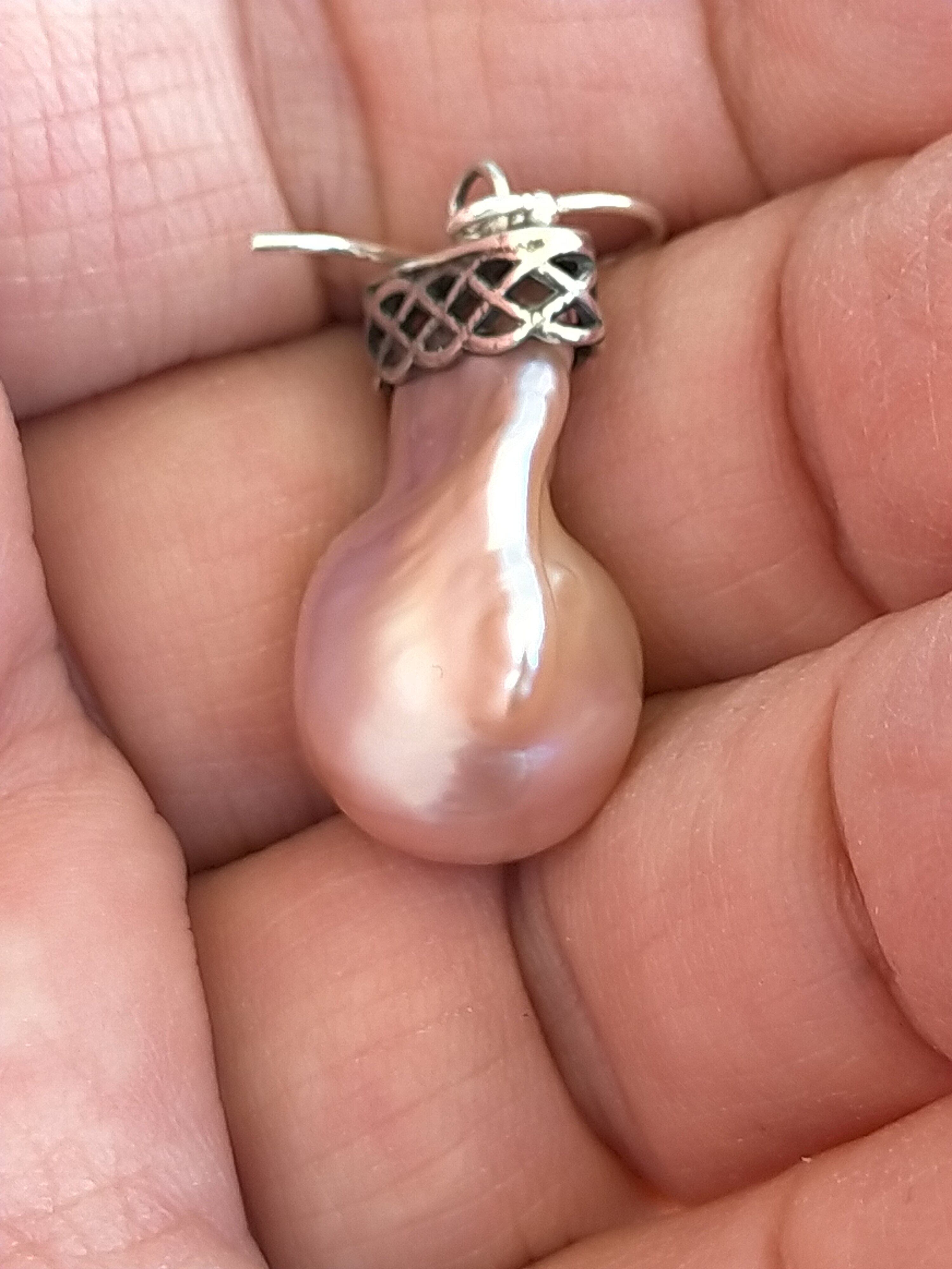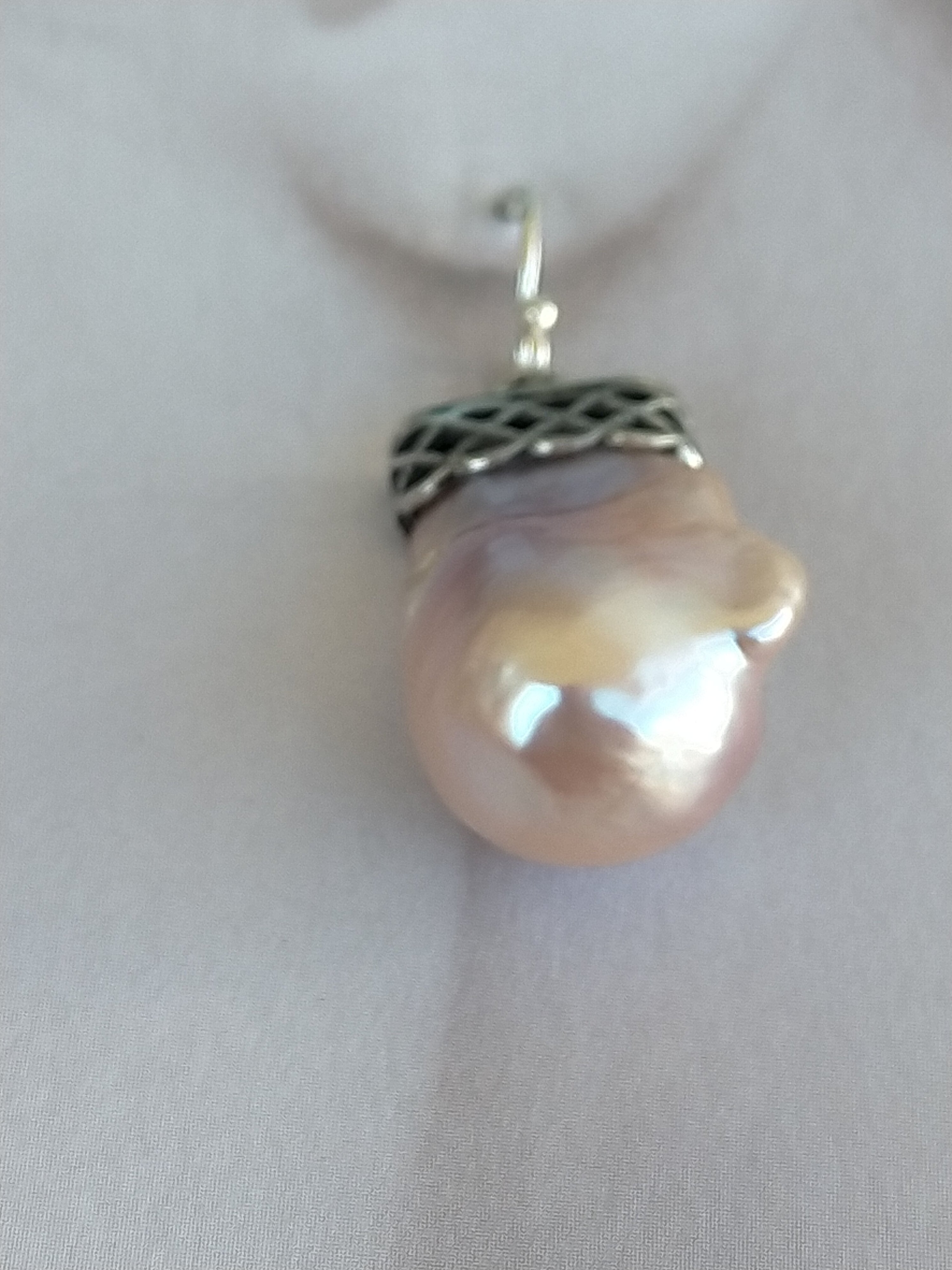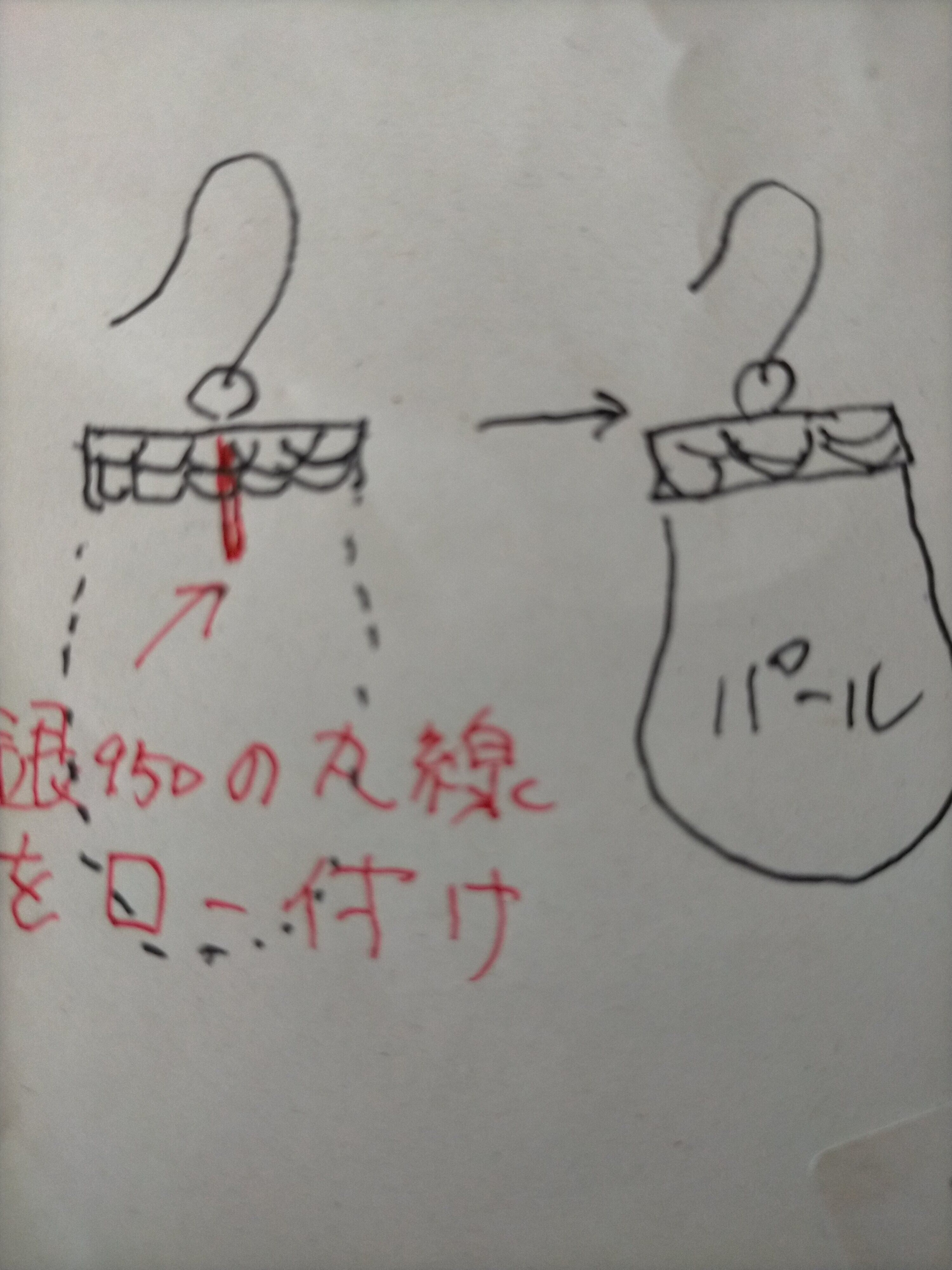 最後の写真をご覧の様に 淡水パールとの金具の接着の仕方は パールの先端に0.9mmの穴を開けて 金具の方には 0.9mmの銀の丸線を ロー付けして パールの先端に強力ABを 付けて はめ込み しました 見えない部分だけボンド付けしました。