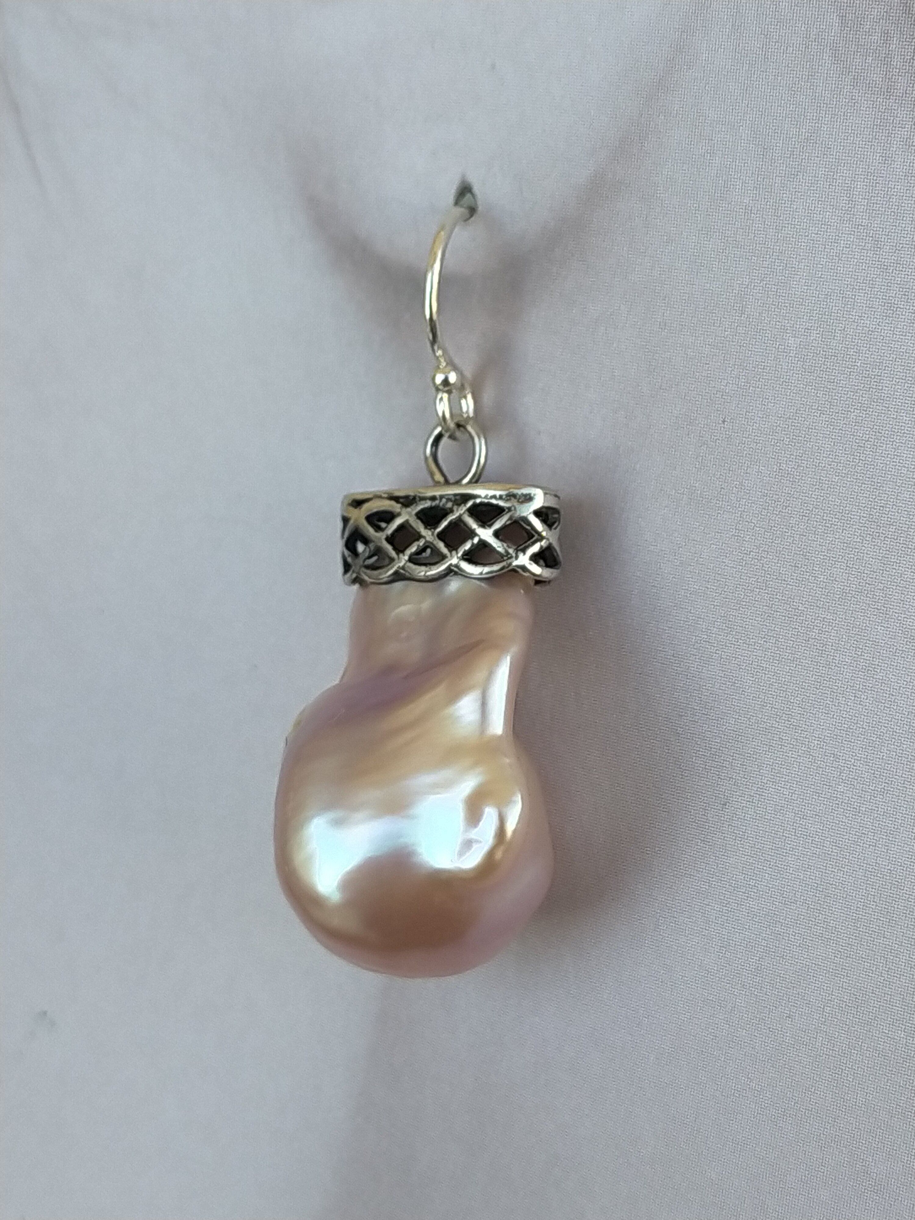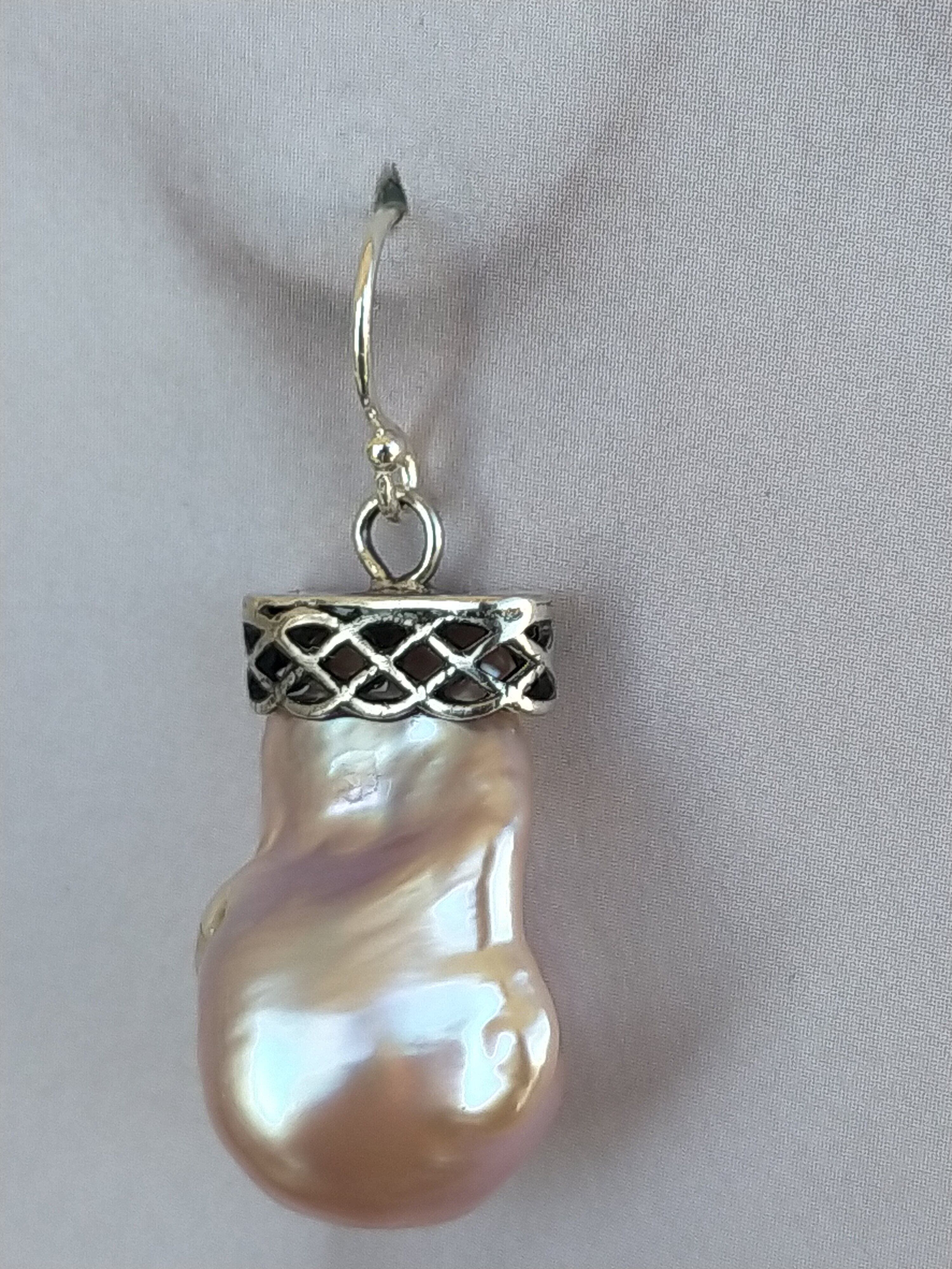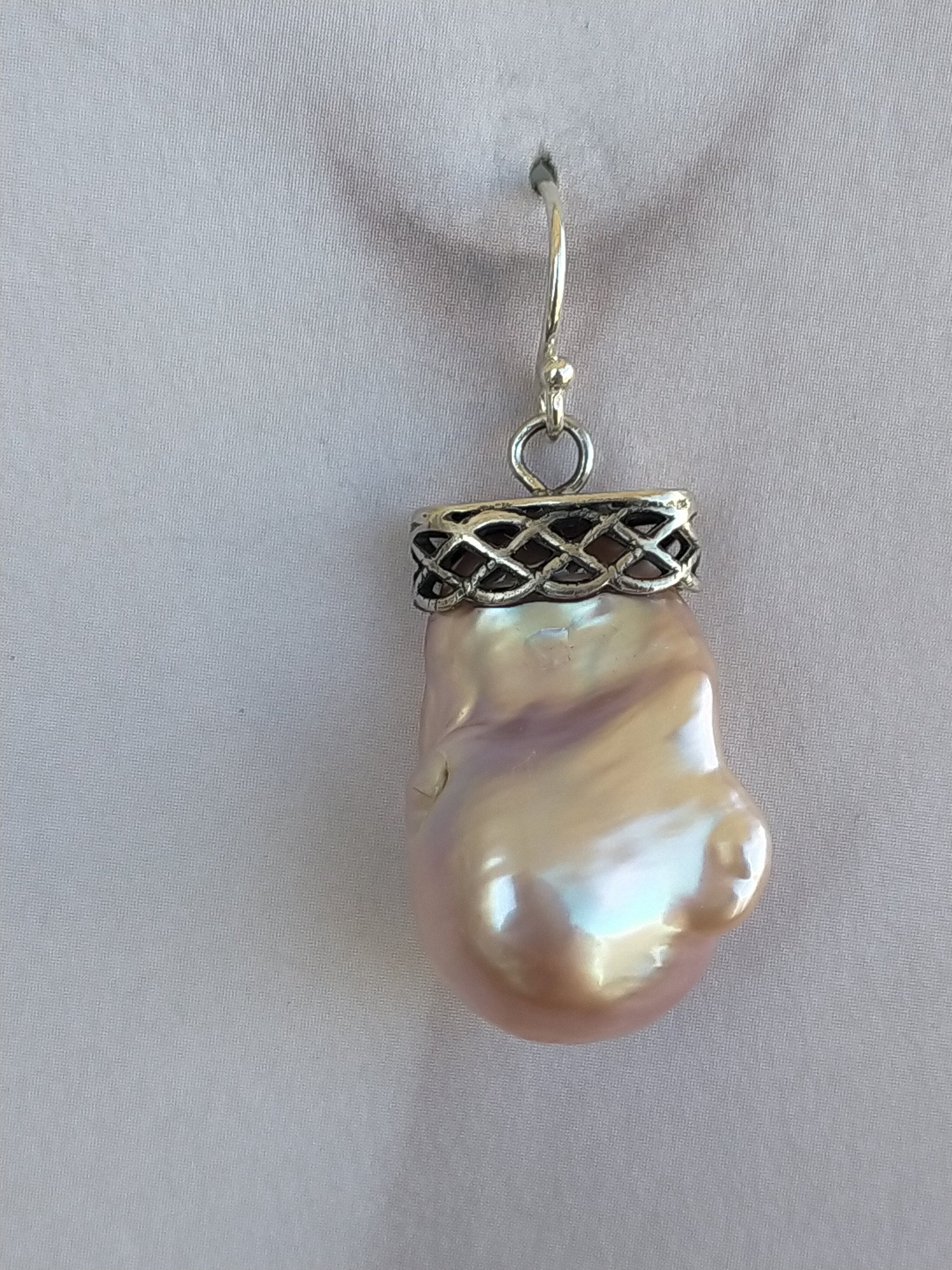 最後の写真をご覧の様に 淡水パールとの金具の接着の仕方は パールの先端に0.9mmの穴を開けて 金具の方には 0.9mmの銀の丸線を ロー付けして パールの先端に強力ABを 付けて はめ込み しました 見えない部分だけボンド付けしました。