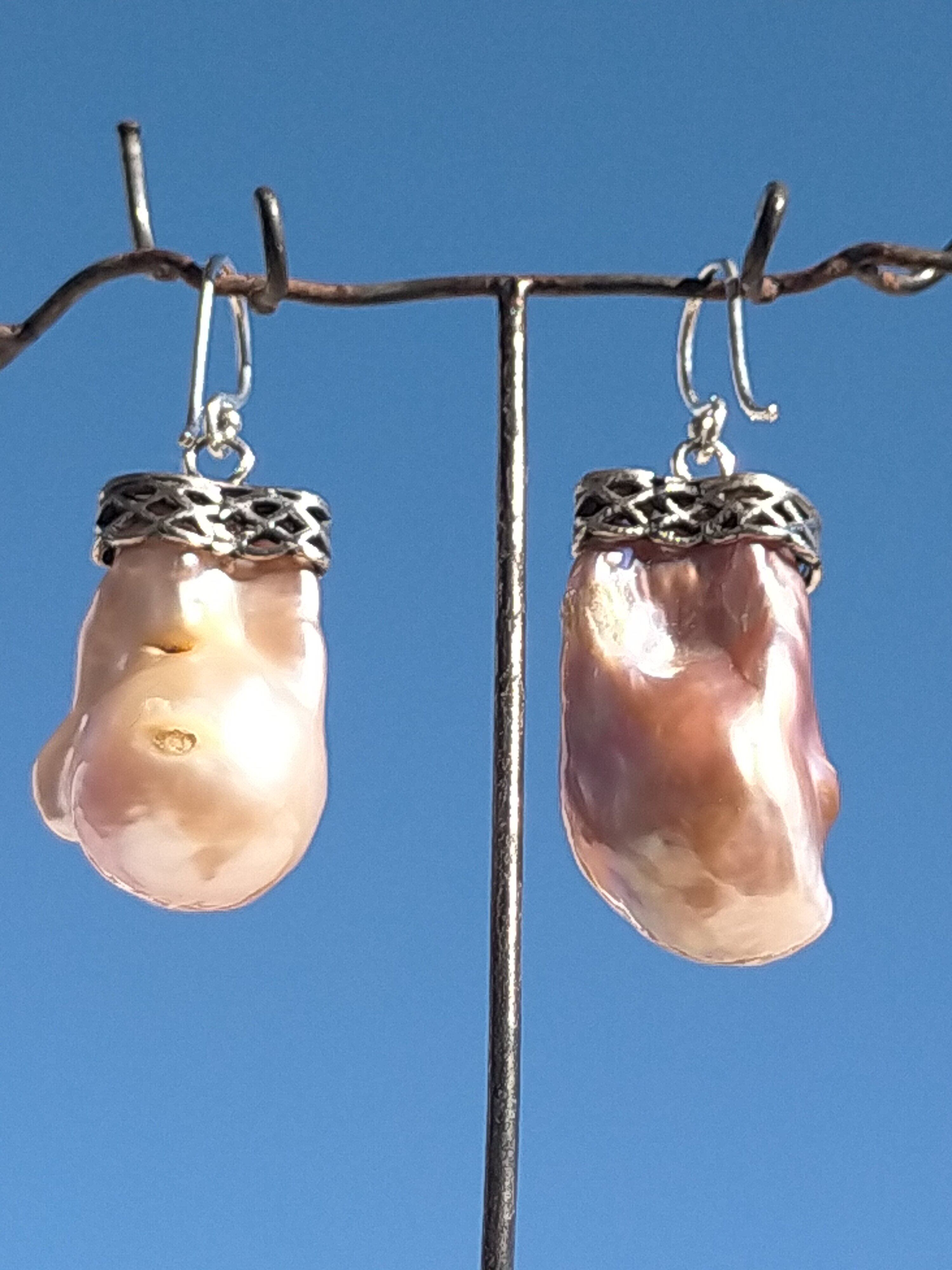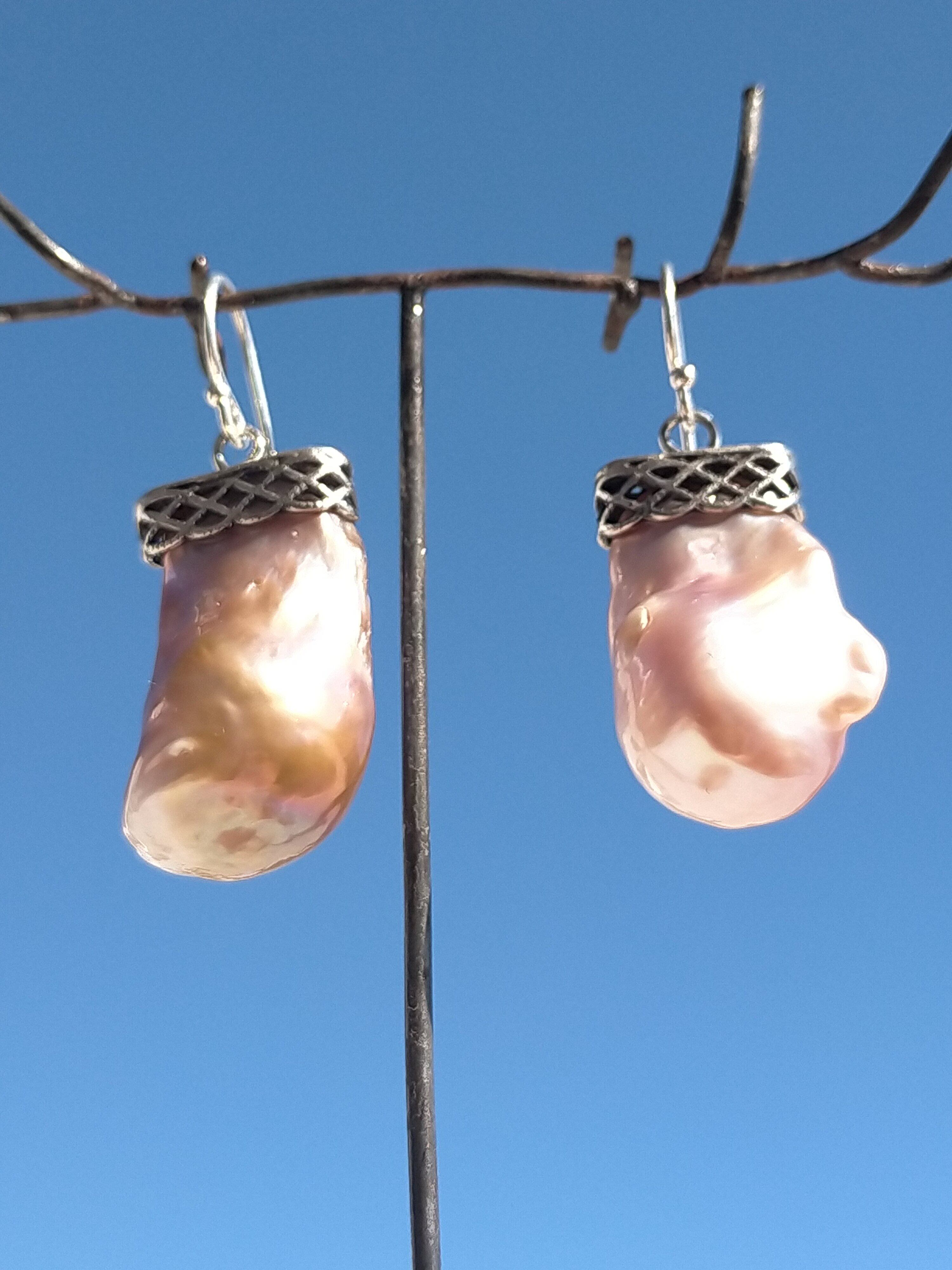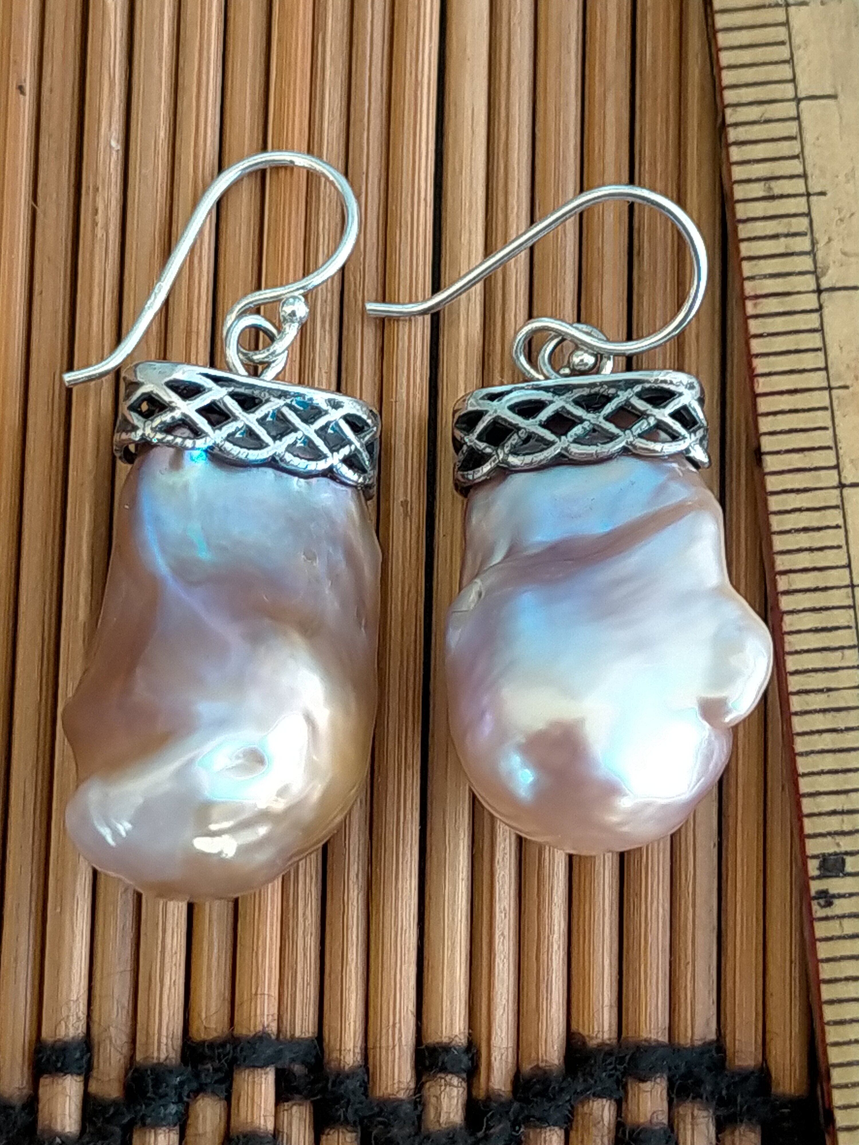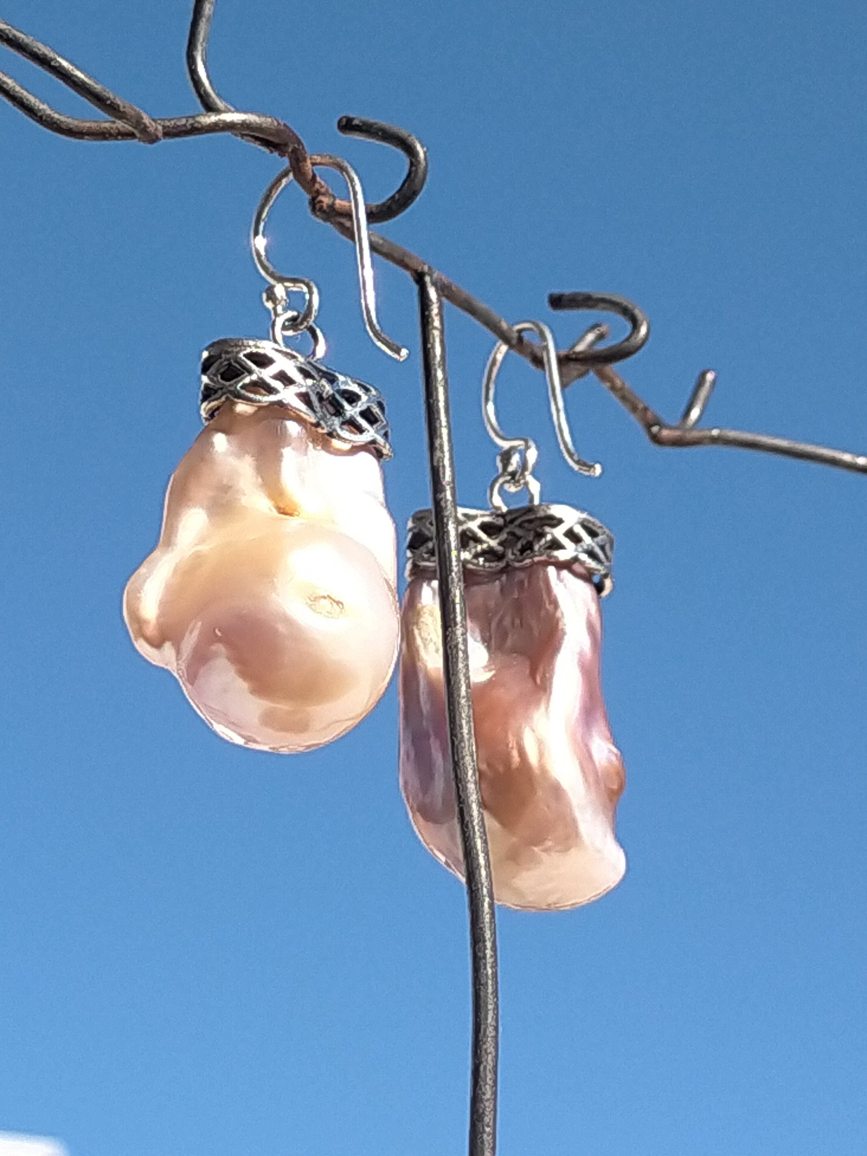 最後の写真をご覧の様に 淡水パールとの金具の接着の仕方は パールの先端に0.9mmの穴を開けて 金具の方には 0.9mmの銀の丸線を ロー付けして パールの先端に強力ABを 付けて はめ込み しました 見えない部分だけボンド付けしました。