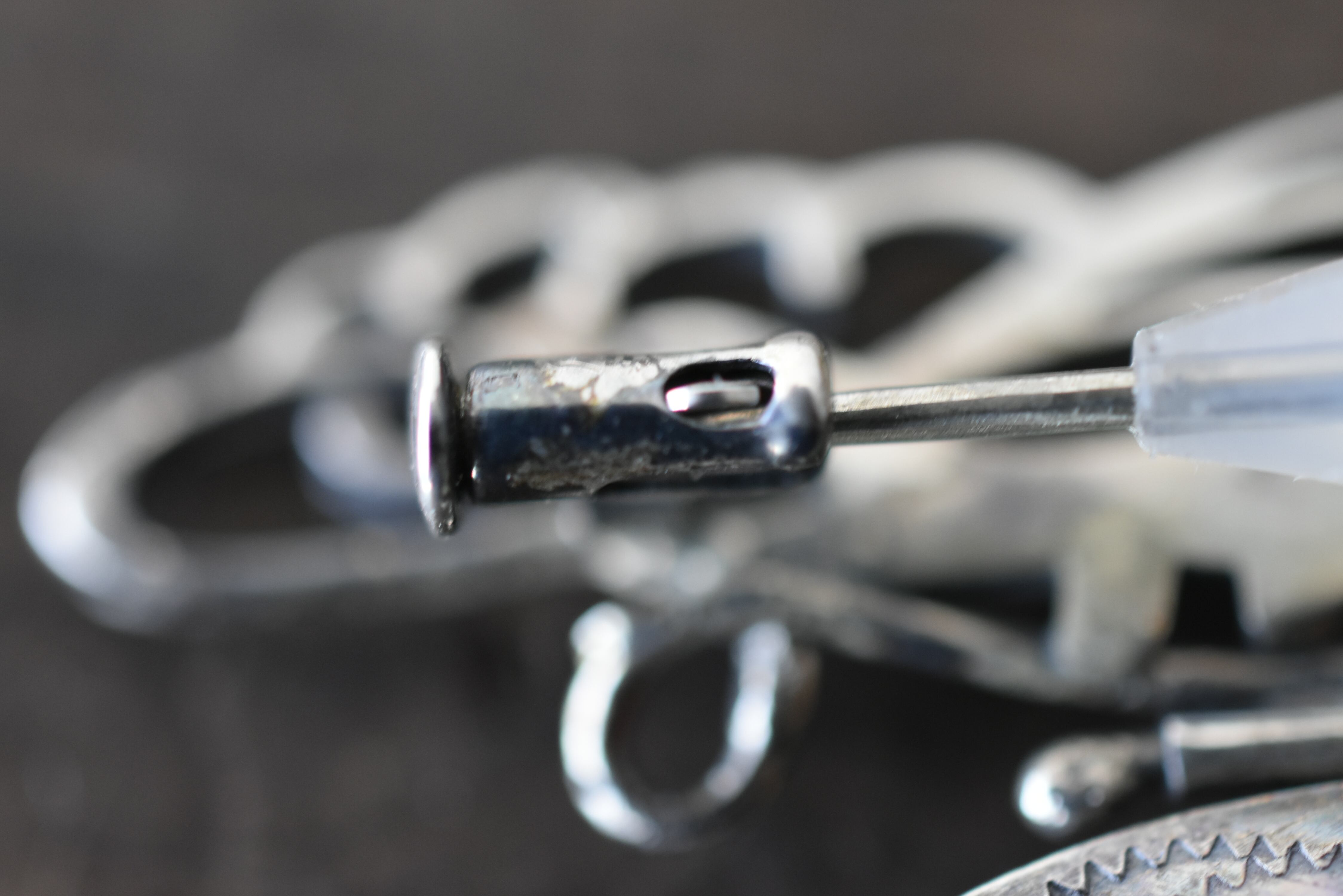 ブローチピンのポッチを引っ張る(写真 9~11)ピンにお付けしたシリコンはブローチピンが