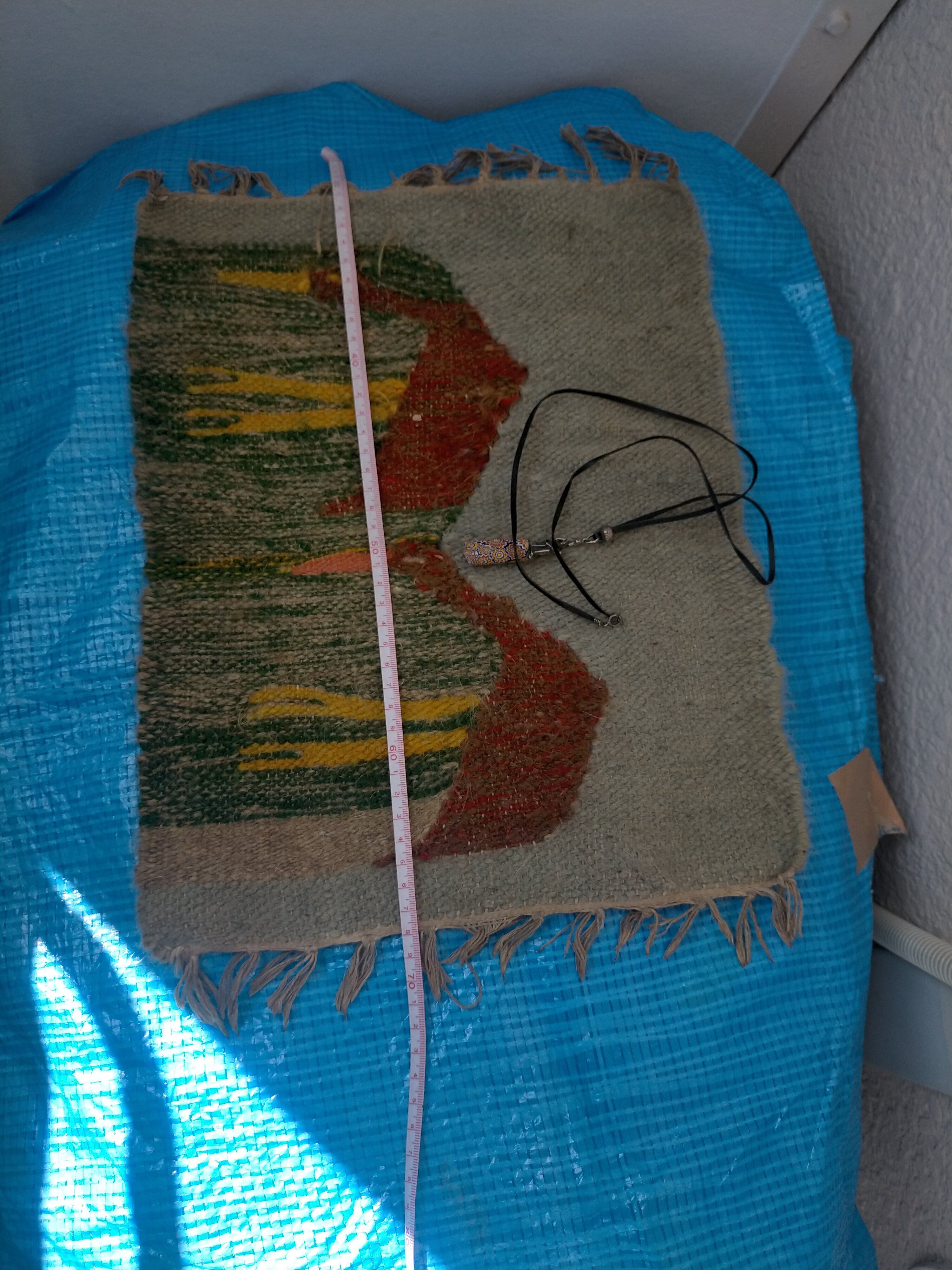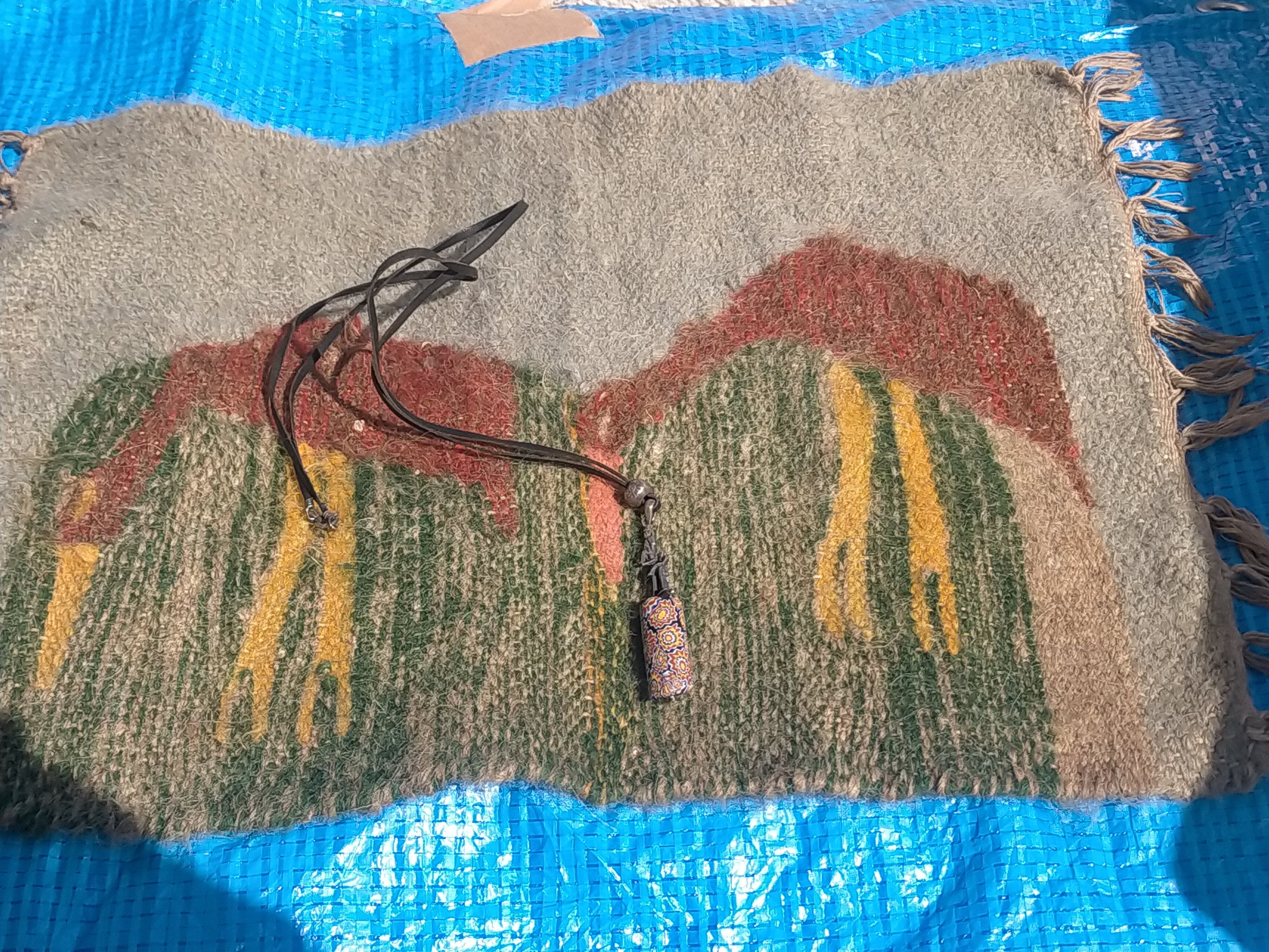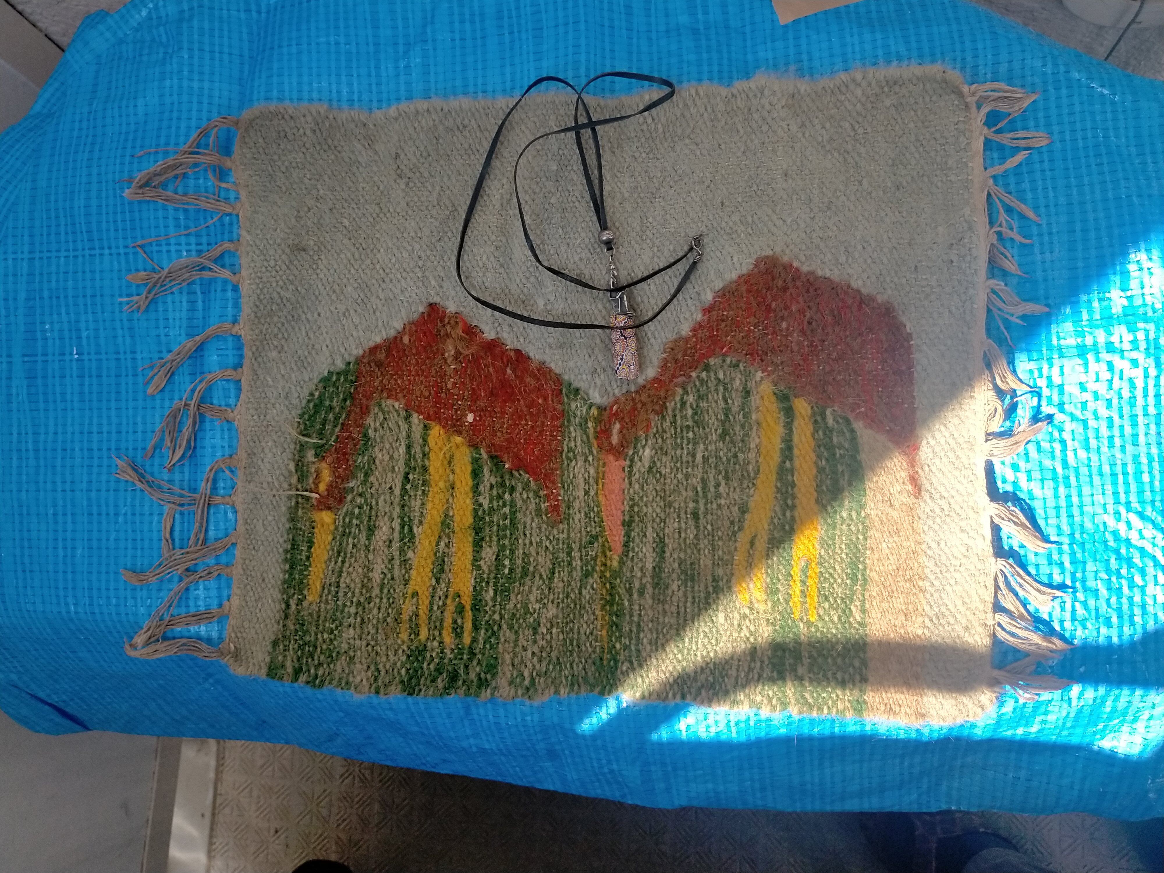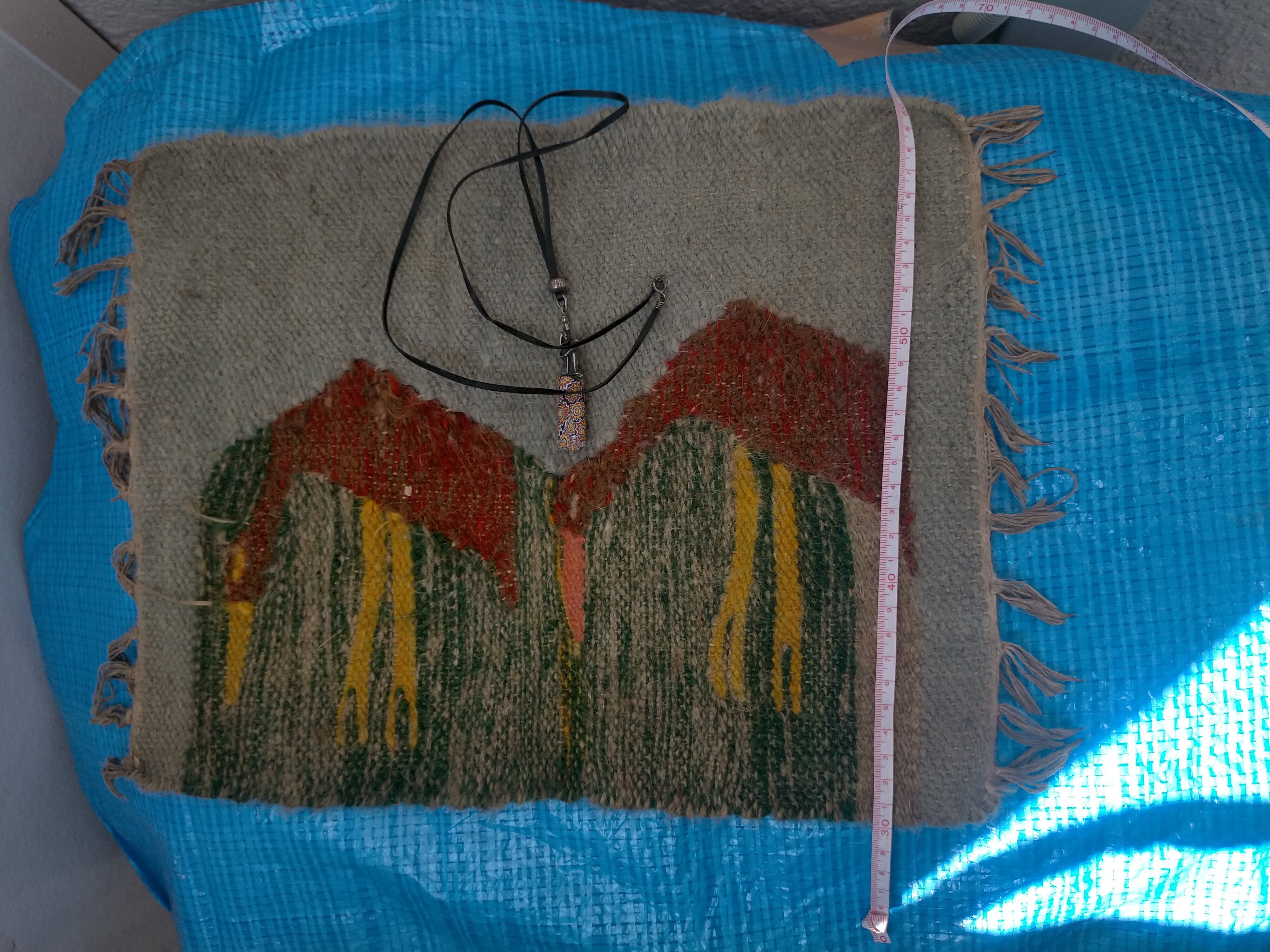 カイロで1番大きな市場で 購入。店で売る用に買いましたが 売れなく仕舞いこんで30年以上 経過してます。ピラミッドも学生割引で入りました。 ラクダの毛です。何かの鳥のデザイン