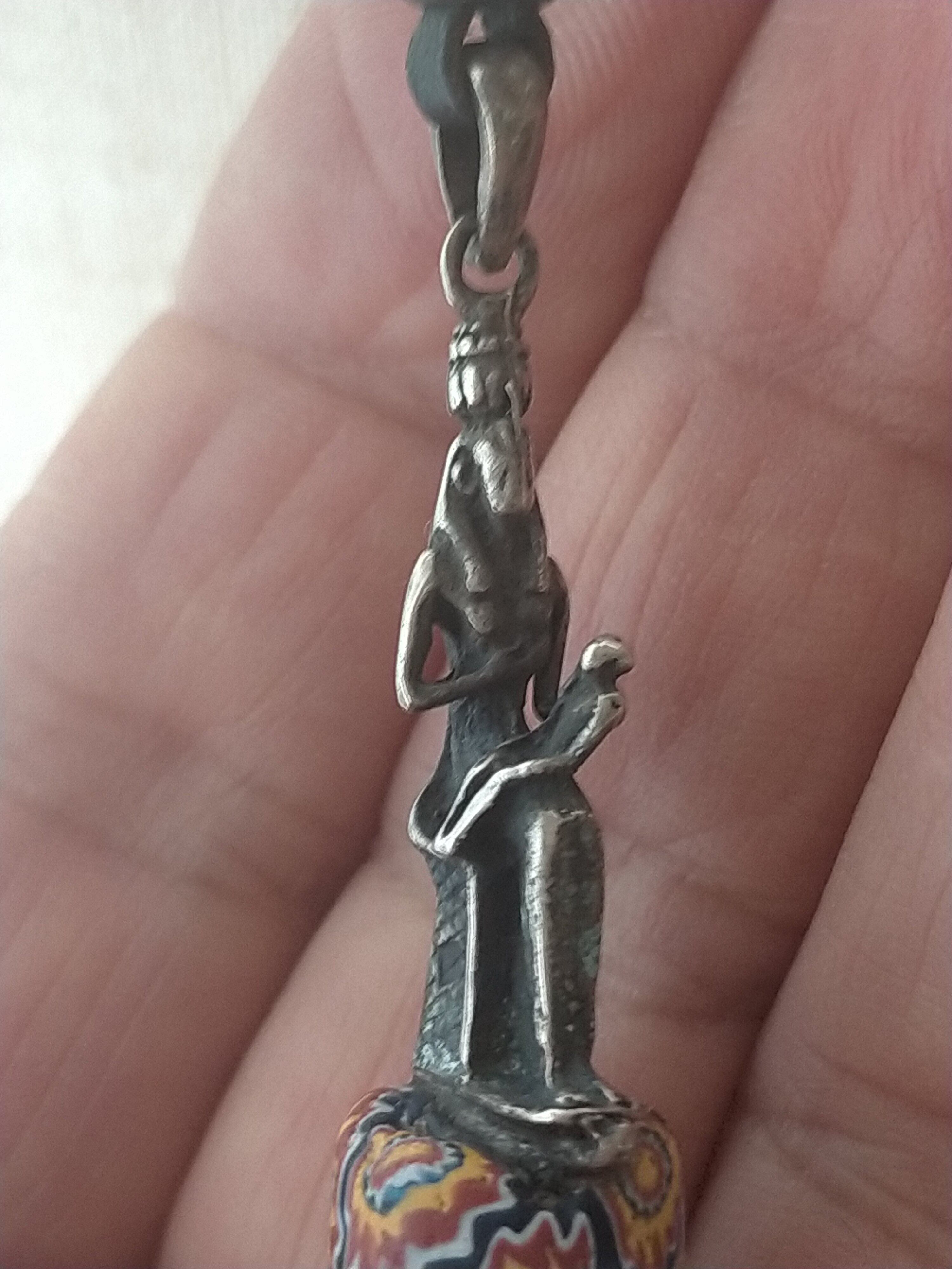イシスはオシリスの妻であり、ホルスの母であり、ファラオの母として象徴的に扱われました。彼女はほぼ常に擬人化された姿で描かれ、玉座に立っているか座っている姿で描かれます。この小像は、ホルスを授乳する女神を描いています。